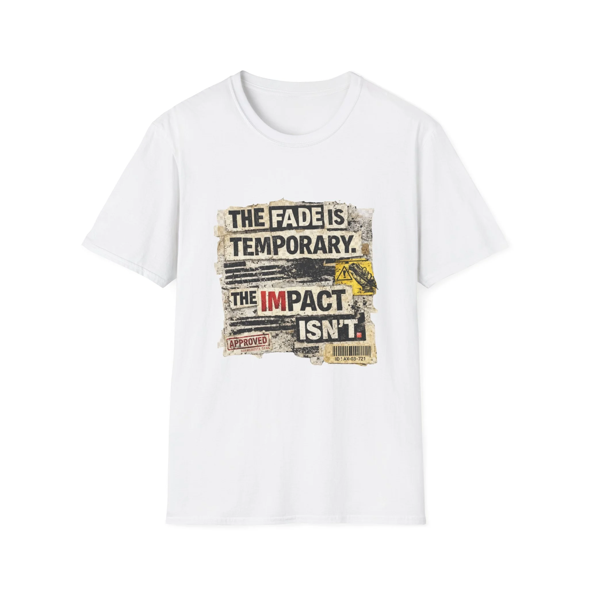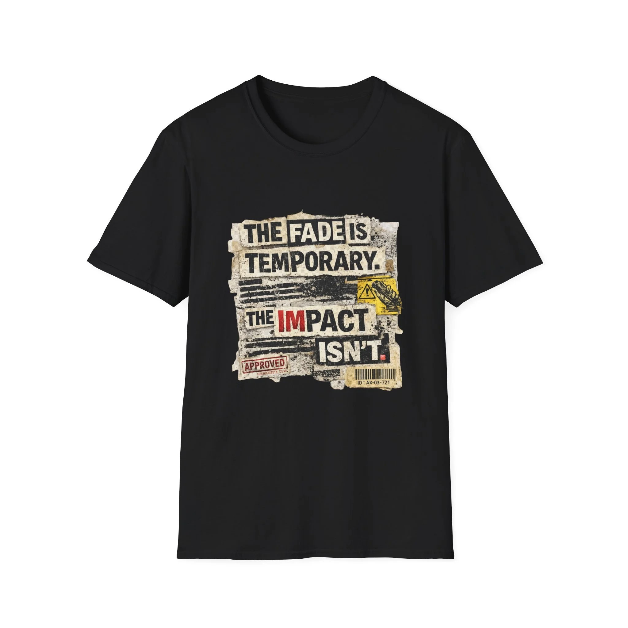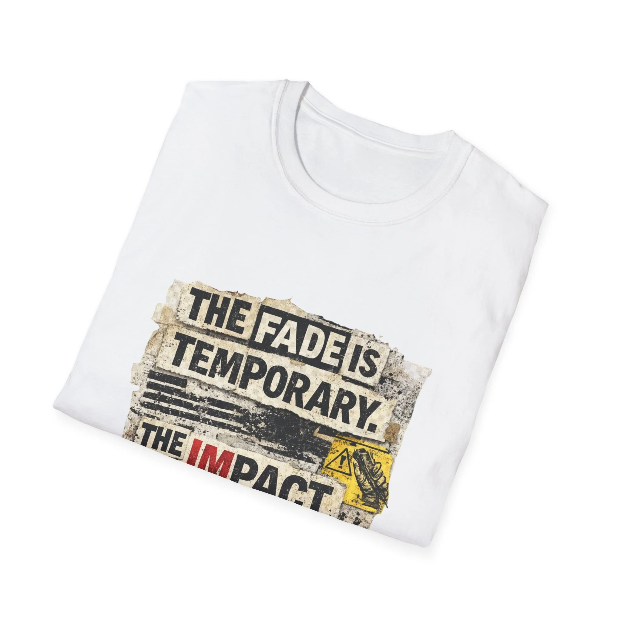 This lightweight, ring-spun cotton tee carries a bold, distressed graphic that reads “THE FADE IS TEMPORARY. THE IMPACT ISN’T.” — a worn-poster aesthetic with torn edges, stamped marks, and vintage paper textures. It sits on a soft crewneck silhouette that layers easily under jackets or stands alone as a statement piece. Wear it when you want clothing that speaks with quiet grit: it reads like a roadside manifesto for people who value action over appearances. The shirt drifts between everyday comfort and streetwise attitude, made to age gracefully while keeping its message front and center.