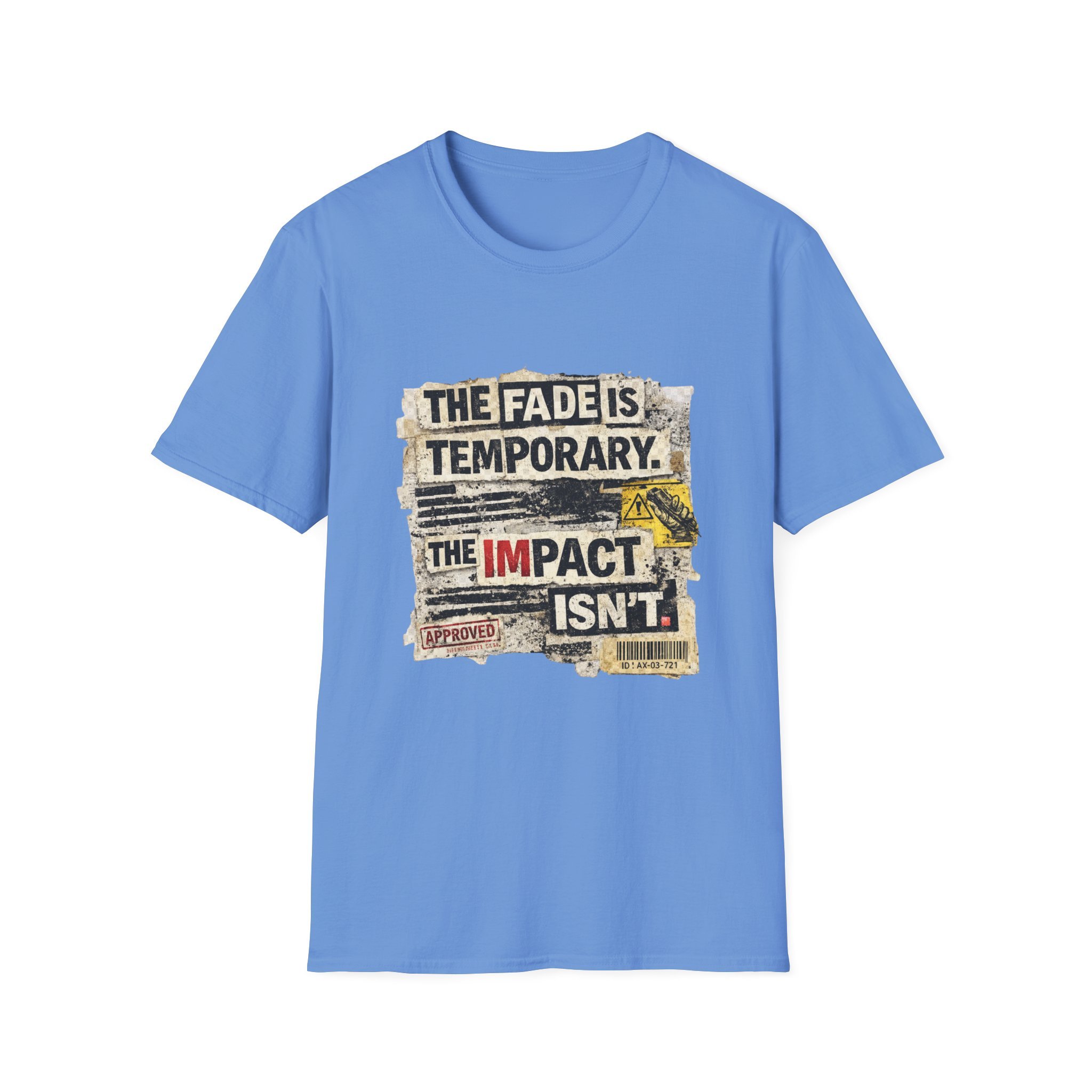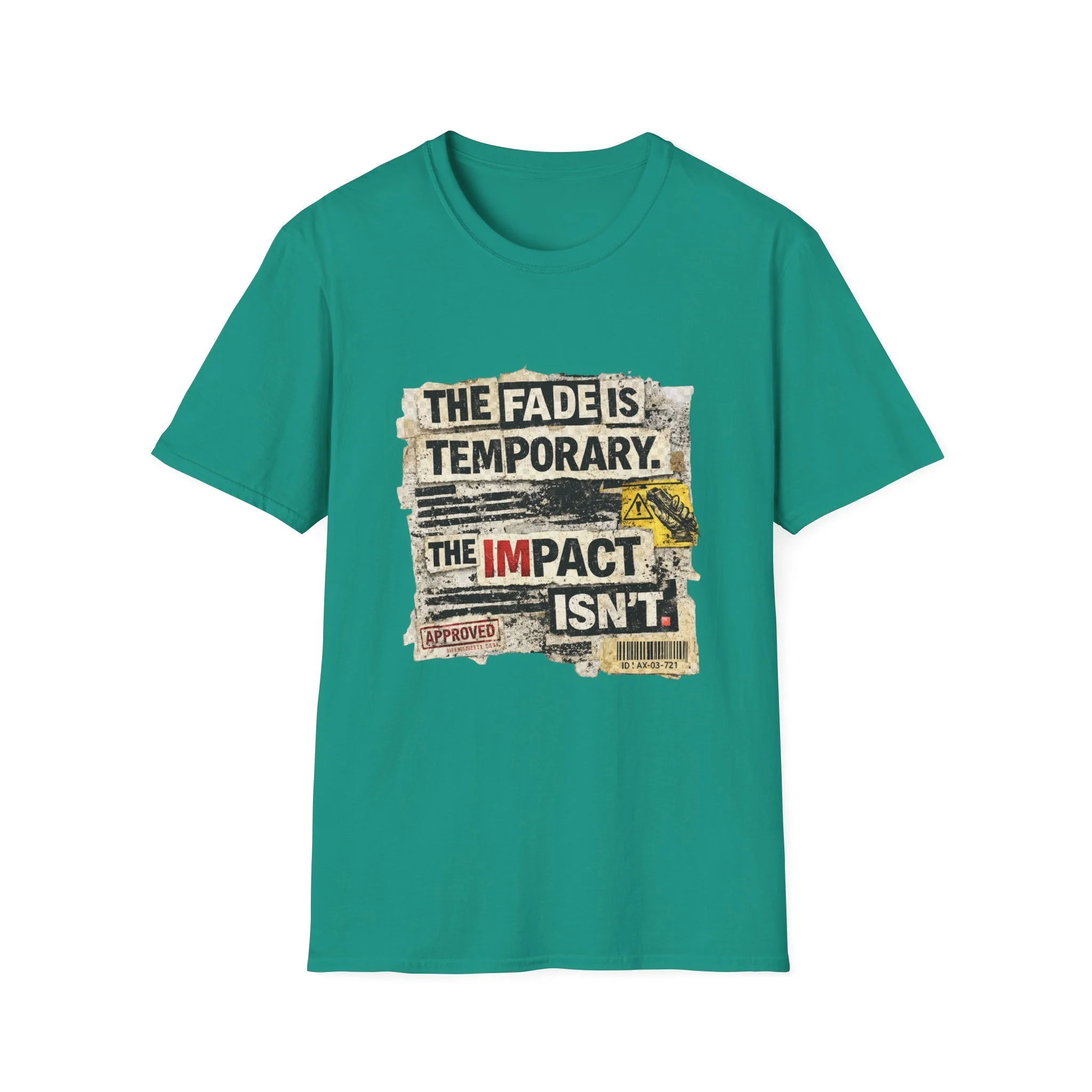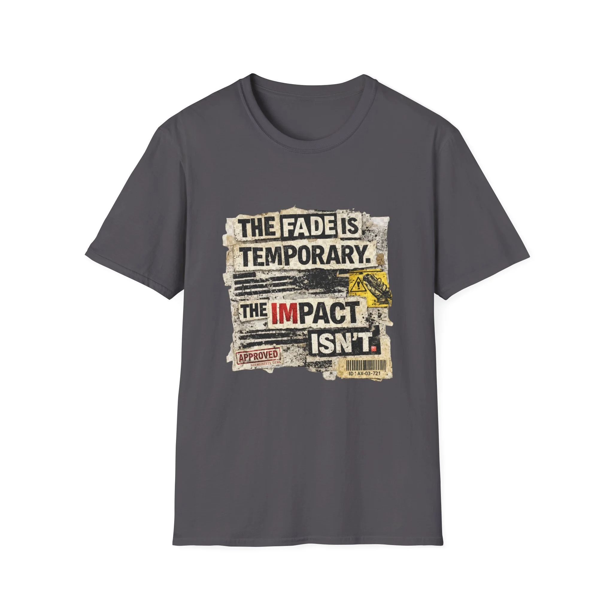 This lightweight, ring-spun cotton tee carries a bold, distressed graphic that reads “THE FADE IS TEMPORARY. THE IMPACT ISN’T.” — a worn-poster aesthetic with torn edges, stamped marks, and vintage paper textures. It sits on a soft crewneck silhouette that layers easily under jackets or stands alone as a statement piece. Wear it when you want clothing that speaks with quiet grit: it reads like a roadside manifesto for people who value action over appearances. The shirt drifts between everyday comfort and streetwise attitude, made to age gracefully while keeping its message front and center.