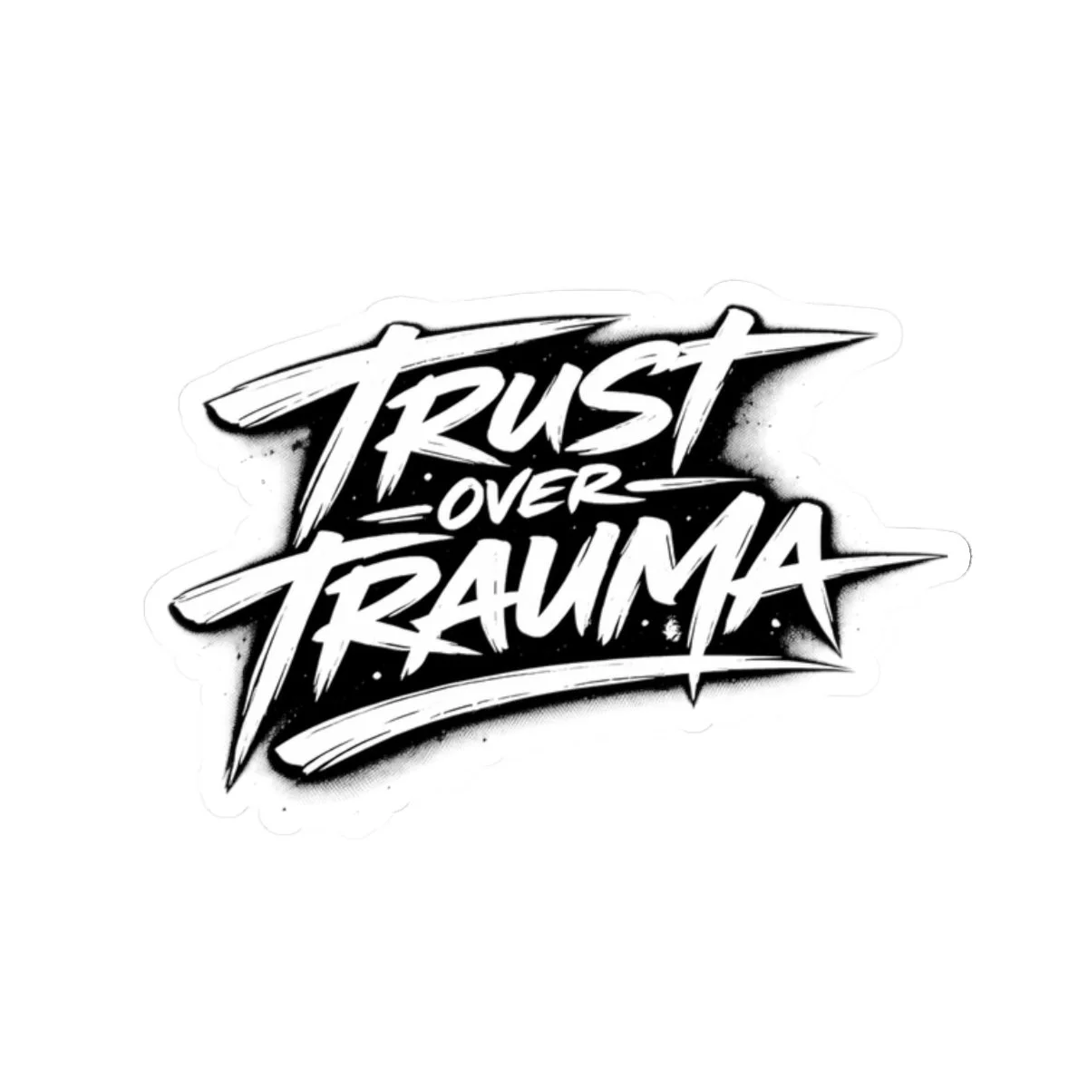 A bold, hand-lettered sticker that carries a message: trust over trauma. The high-contrast black-and-white design reads like street art — sharp brush strokes, energetic motion, and a raw, confident voice. Stick it on a laptop, journal, water bottle, or phone case to make a quiet declaration about healing and boundaries. The glossy finish gives the graphic a punchy sheen while the kiss-cut shape hugs the lettering for a clean, cut-out look. This is for anyone who wants a small but strong reminder to choose trust, resilience, and forward motion in everyday life.