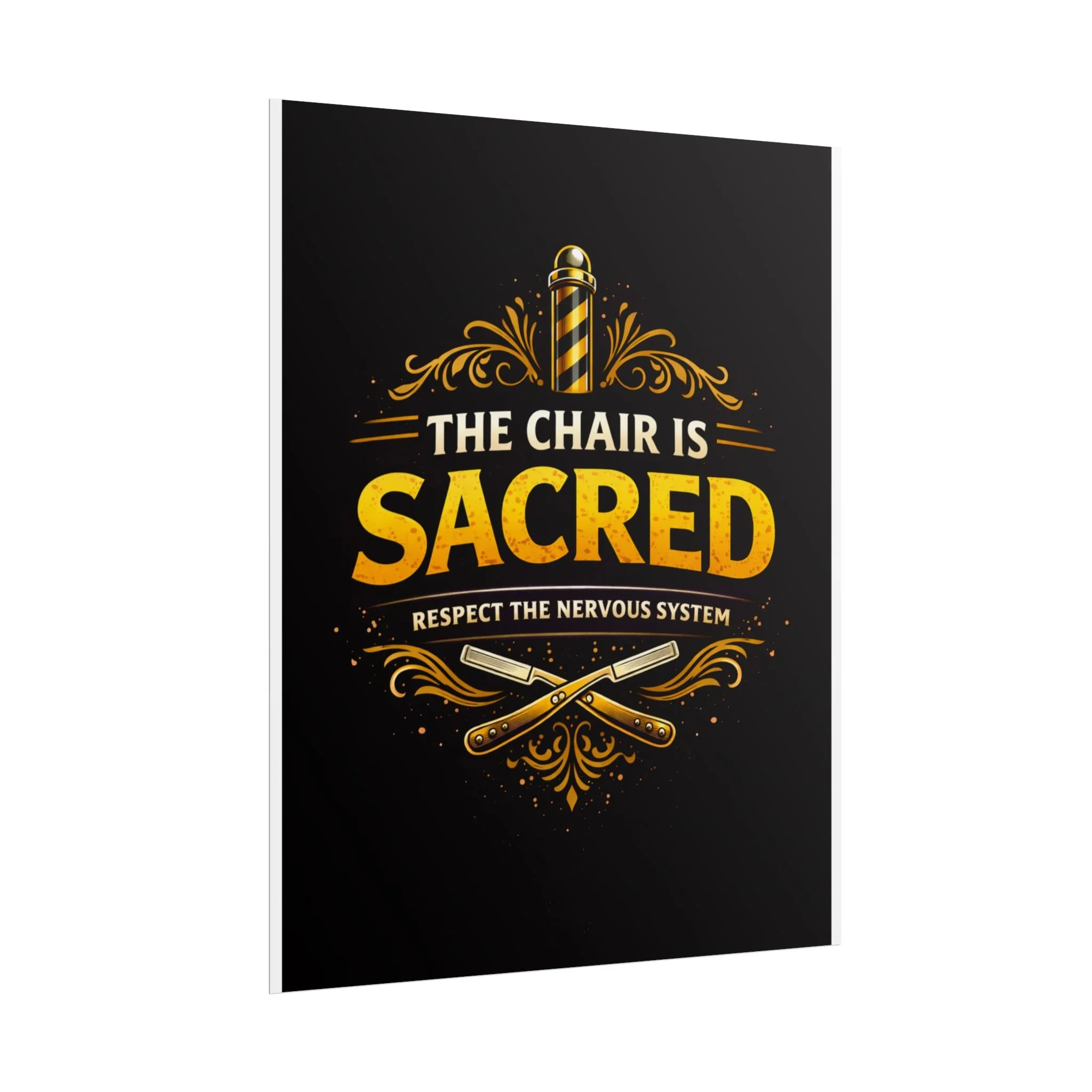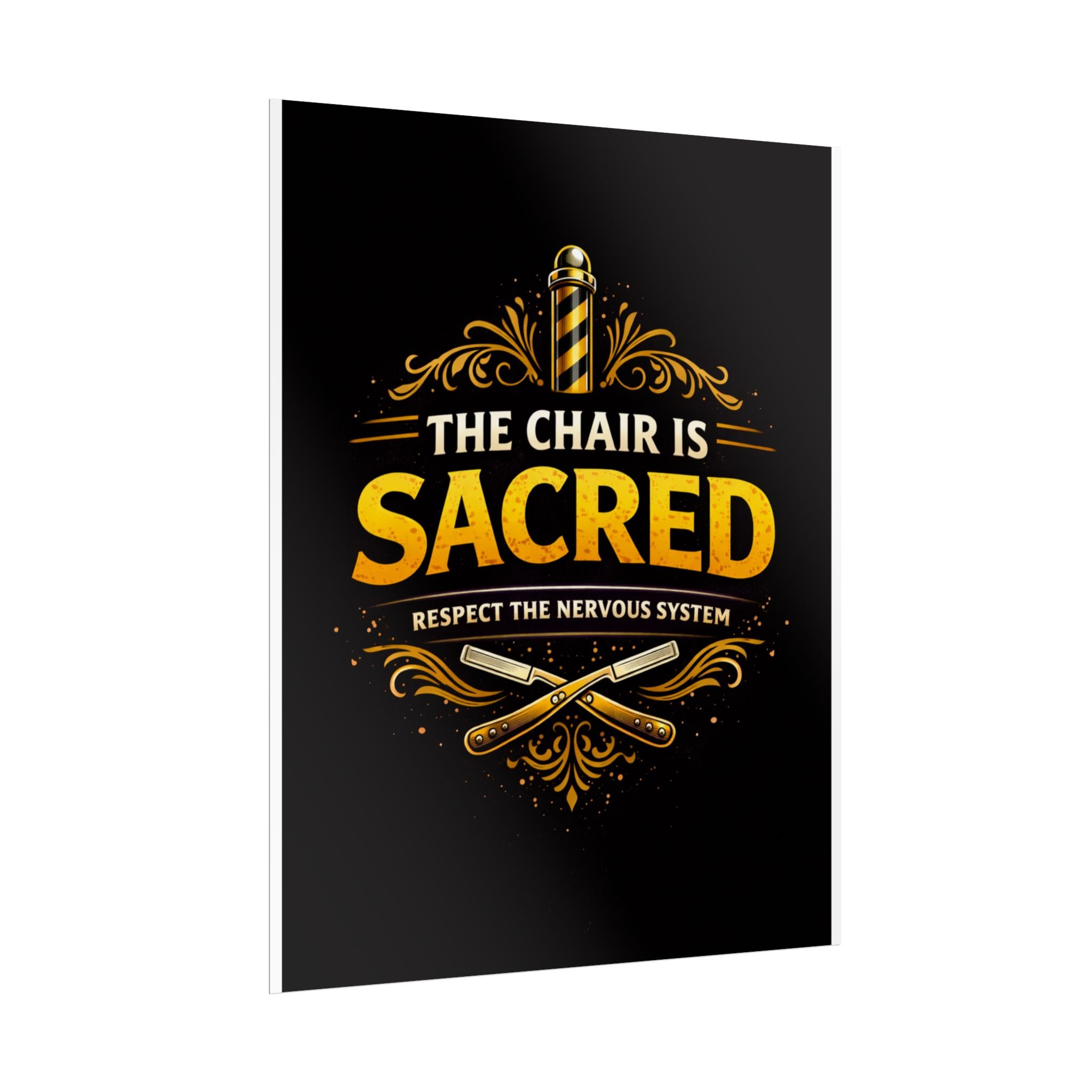 This rolled poster brings barbershop pride to the wall with warm, vintage-inspired gold lettering and ornate flourishes on a deep black field. The central slogan—"The Chair Is Sacred"—sits beneath a classic barber pole and crossed razors, giving the piece a respectfully bold, slightly irreverent voice that resonates in a shop, studio, or personal grooming corner. Printed with museum-quality Giclée or choice photo papers, the design keeps its rich contrast and textured detail whether you choose fine art, matte, or semi-glossy finishes. It arrives rolled for easy storage and framing, and the range of sizes and orientations lets you place it above a workstation, behind a counter, or in a barbershop waiting area to set a proud, professional tone.