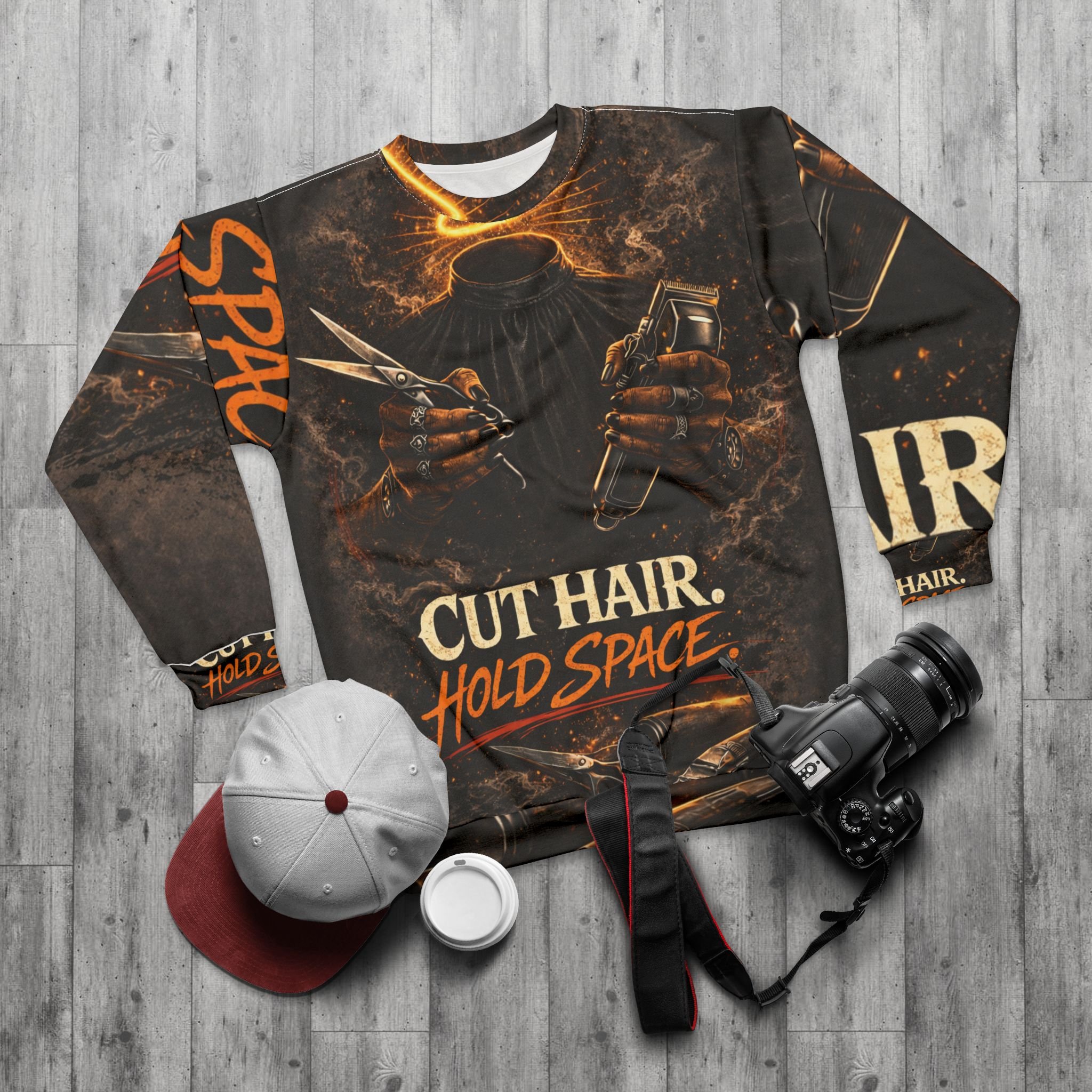This crewneck sweatshirt channels the energy of a busy, creative barber or stylist with bold, all-over artwork that tells a story at a glance. Dark, smoky backgrounds frame a haloed figure holding scissors and a spray bottle, while the hand-lettered line “CUT HAIR. HOLD SPACE.” reads like a quiet promise — steady hands, calm presence. Lightweight yet structured, the piece moves easily from the shop to the street. Wear it between appointments, on late-night consultations, or when you want to carry your craft with you. The design speaks like a colleague who gets the grind: respectful, steady, and a little fierce.